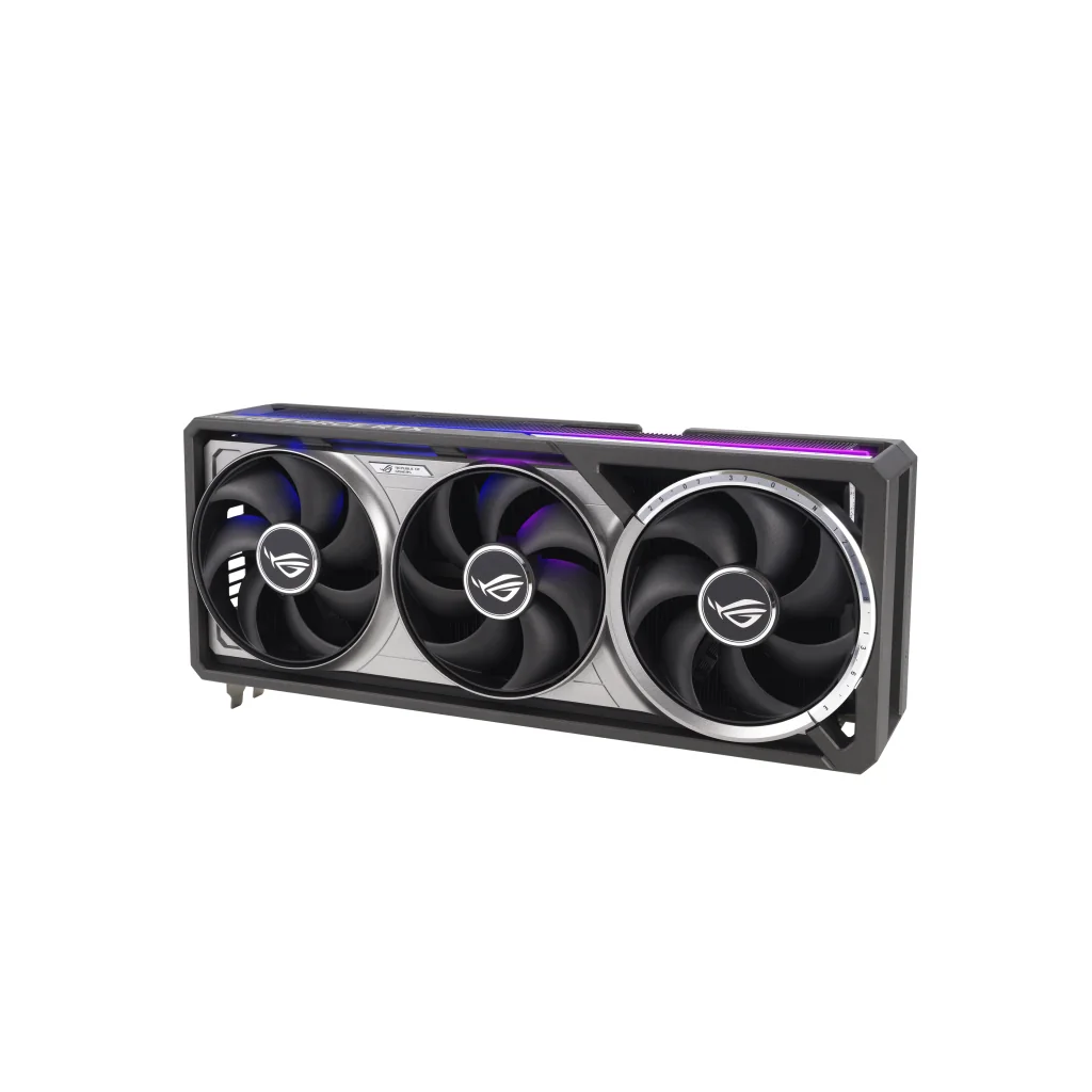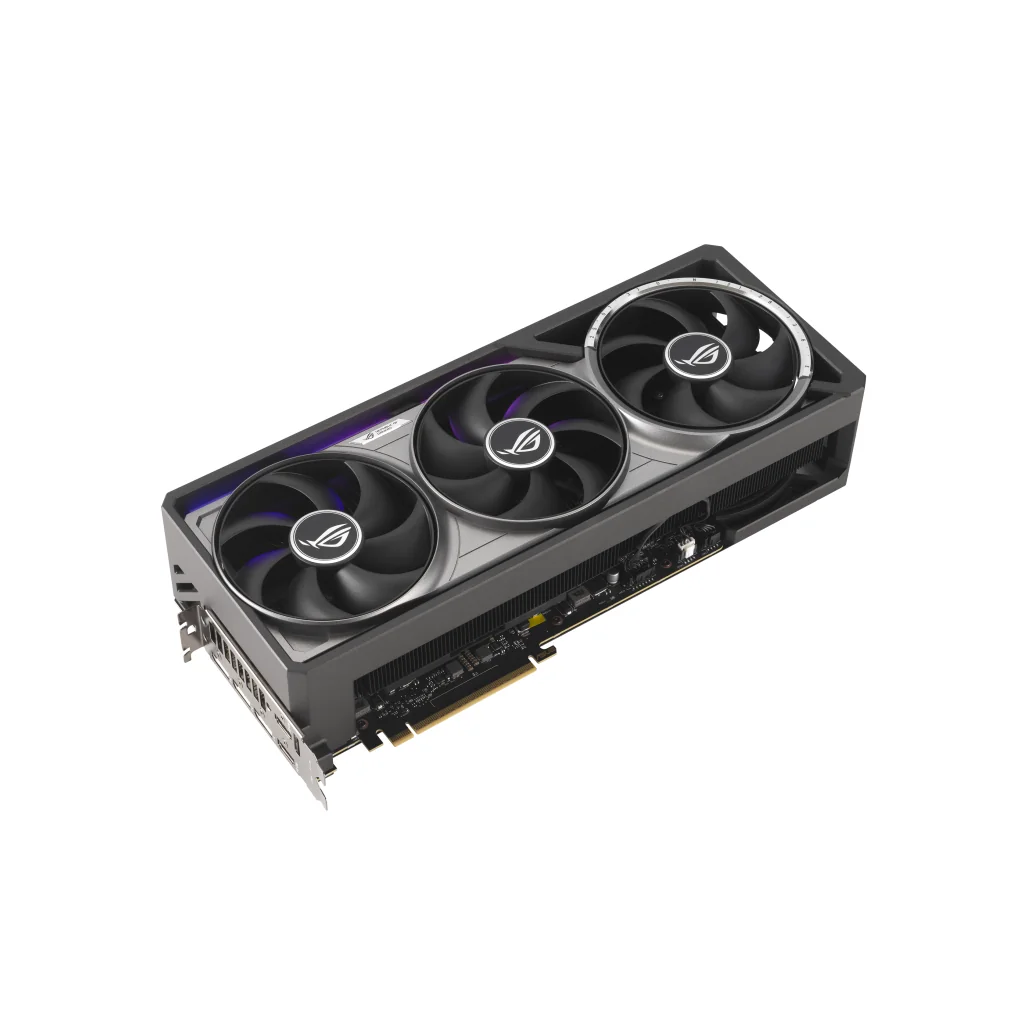 Cooling is a standout feature, introducing ROG’s first quad-fan design that creates a vertical airflow channel to significantly increase pressure and cooling efficiency. Combined with a patented vapor chamber and phase-change thermal pad, the GPU maintains optimal temperatures even under extreme workloads.