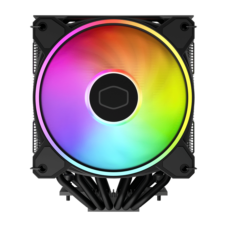 The dual 120mm fans deliver high airflow and static pressure, ensuring efficient heat dissipation even under heavy CPU loads. The all-black finish with a sleek aluminum top cover adds a modern, aggressive look, while customizable ARGB lighting enhances system aesthetics.